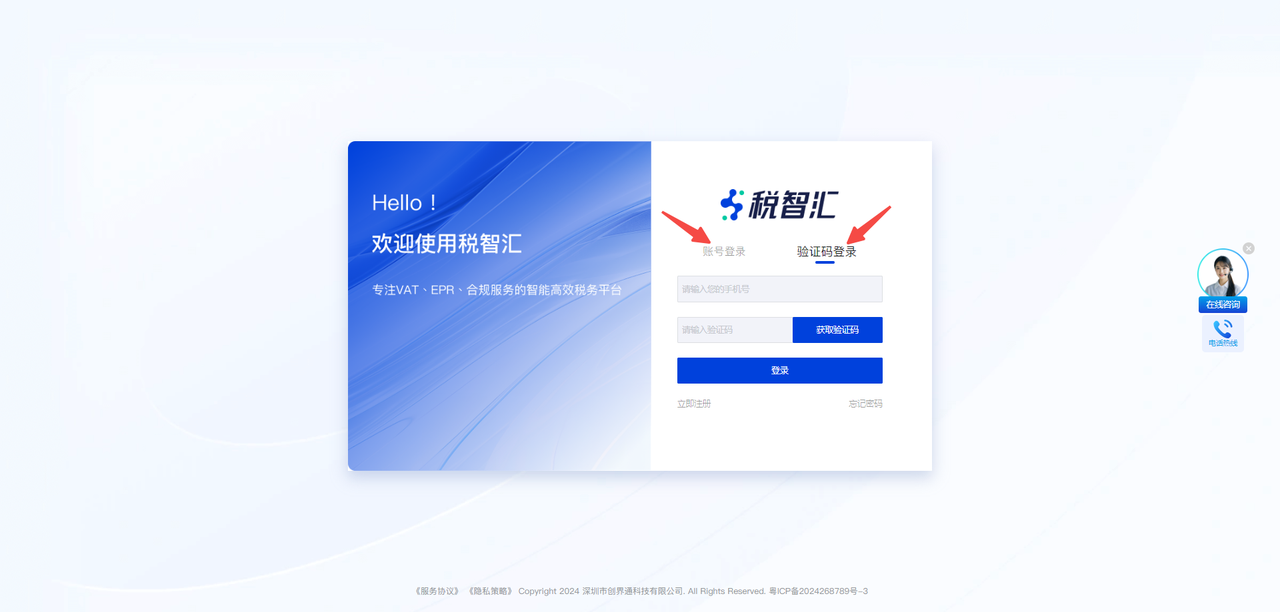 进入税智汇平台登录页面后,输入手机号码,点击【获取验证码】,填写手机收到的6位数字验证码,点击【登录】即可成功登录。